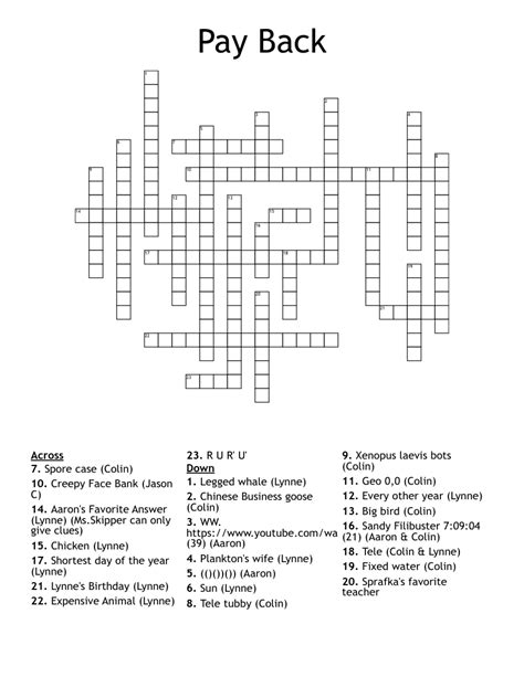 Pay Back Crossword. Web pay back crossword clue answers are listed below and every time we find a new solution for this clue, we add it on the answers list down below. We will try to find the right answer to this particular crossword clue.