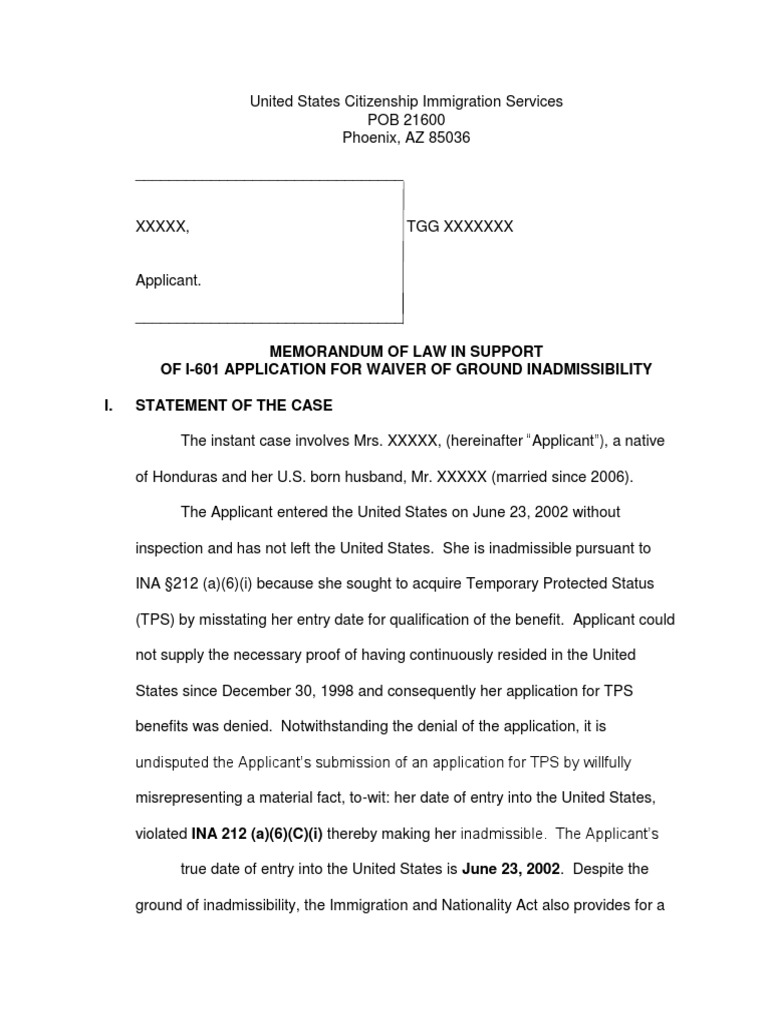 I 601 Waiver Example Letters - User this form to seek a waiver of grounds of inadmissibility if you are inadmissible to the united states and are.