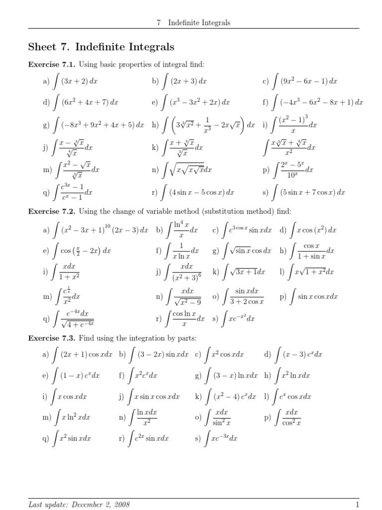 Sheet 7. Indefinite Integrals Mathematical Analysis Calculus