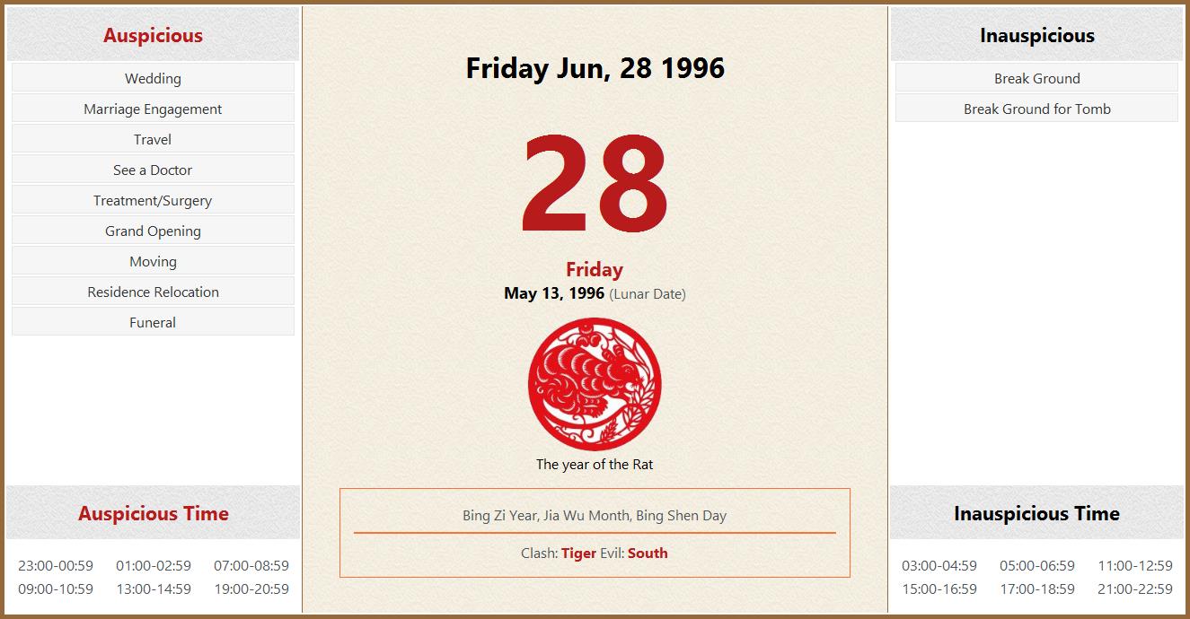 June 28, 1996 Almanac Calendar Auspicious/Inauspicious Events and Time