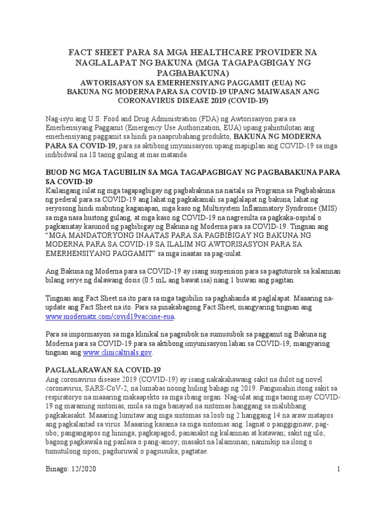 Tagalog EUAModerna COVID19 Vaccine HCP Fact SheetFull Prescribing