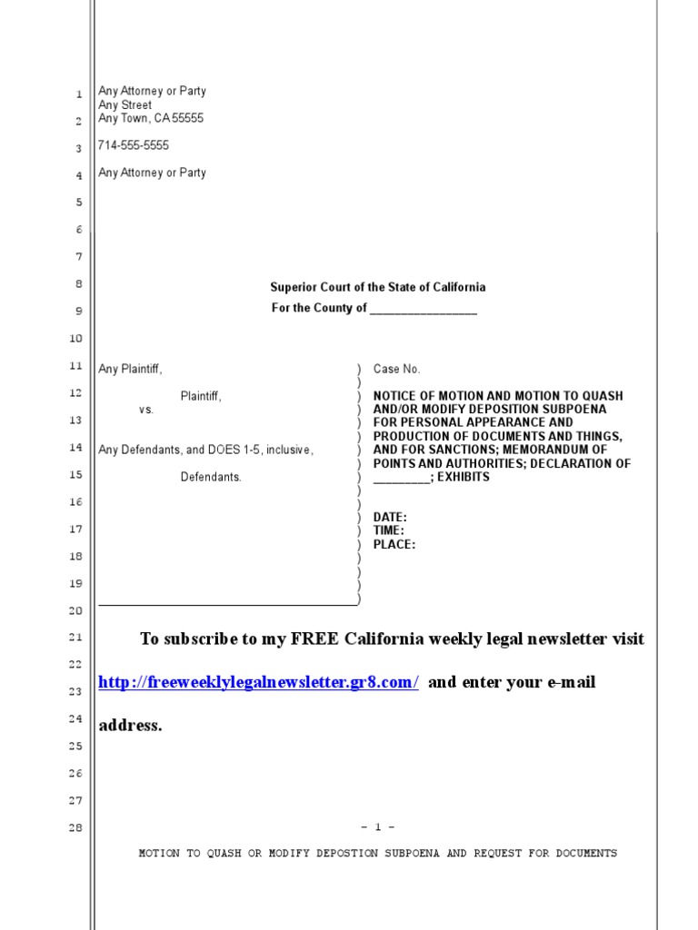 Sample Motion to Quash or Modify Deposition Subpoena in California