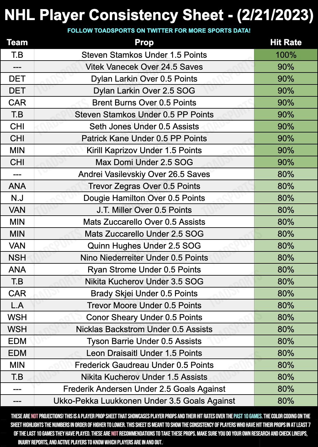 toad on Twitter "NHL Consistency Sheet (2/21/2023) Today's sheet