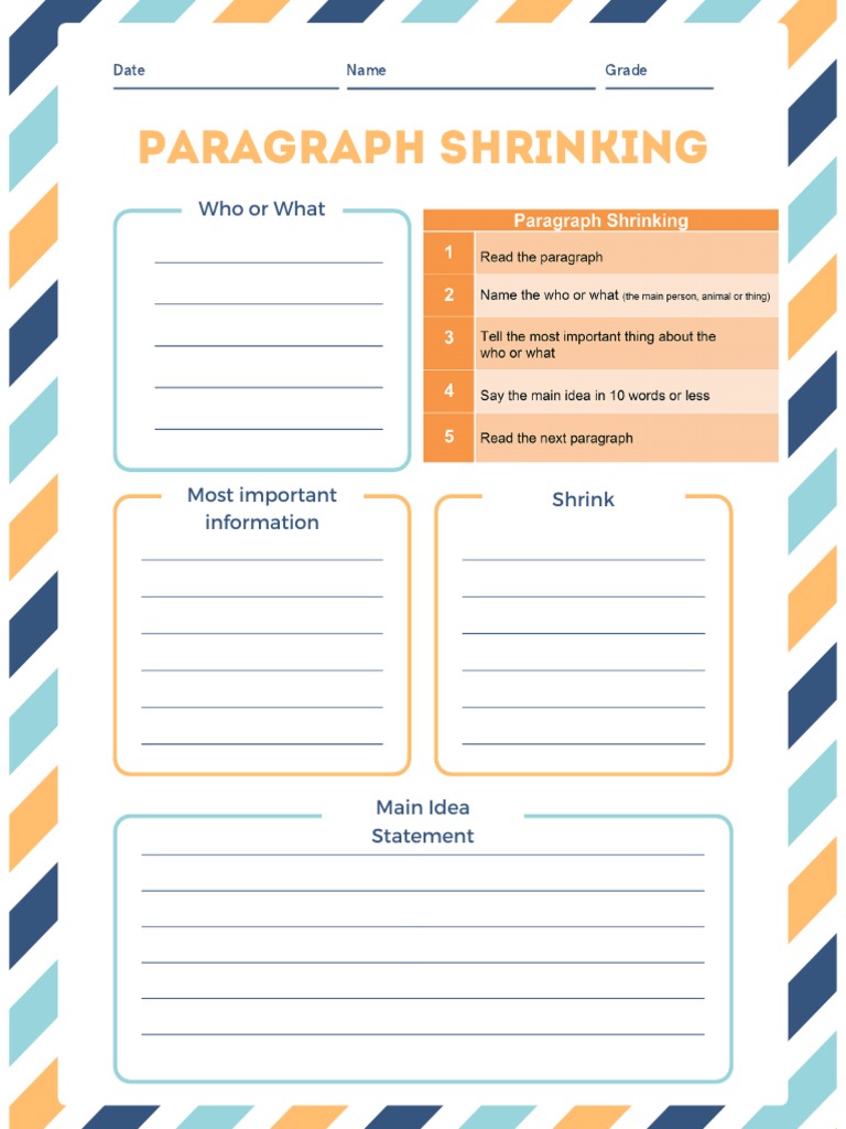 Web partner reading and paragraph shrinking involve the following steps (burns et al., 2015; Web use template #15 to teach strategy in grades 2 and 3 teacher tells the students the “what” of paragraph shrinking: The second activity in each pals session, paragraph shrinking, is designed to improve. Web paragraph shrinking (summarizing graphic organizer) 4.8 (29 ratings) 856 downloads.