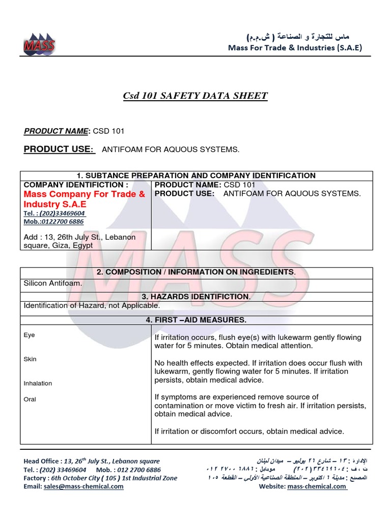 Csd 101 ANTIFOAM Safety Data Sheet Personal Protective Equipment