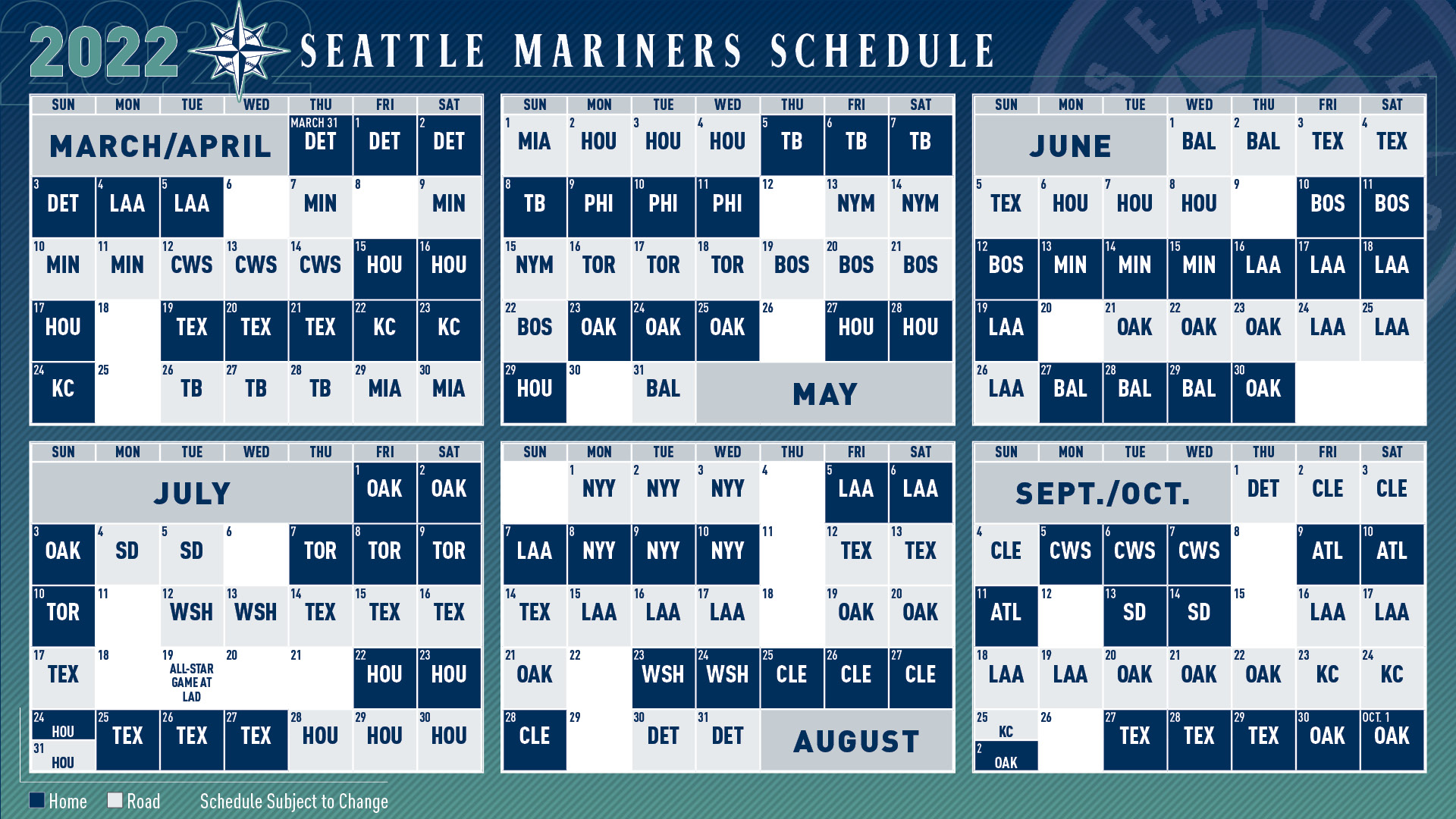 Web 2022 seattle mariners schedule home road schedule subject to change. Web seattle mariners schedule kyle lewis 2020 rookie of the year sun mn tue wed thu fri sat my 1 laa 6:10 2 laa 1:10 3 bal 7:10 4 bal 7:10 5 bal 12:40 6 7 tex 5:05 8 tex 4:05 9 tex 11:35 0 11 lad 7:10 2.