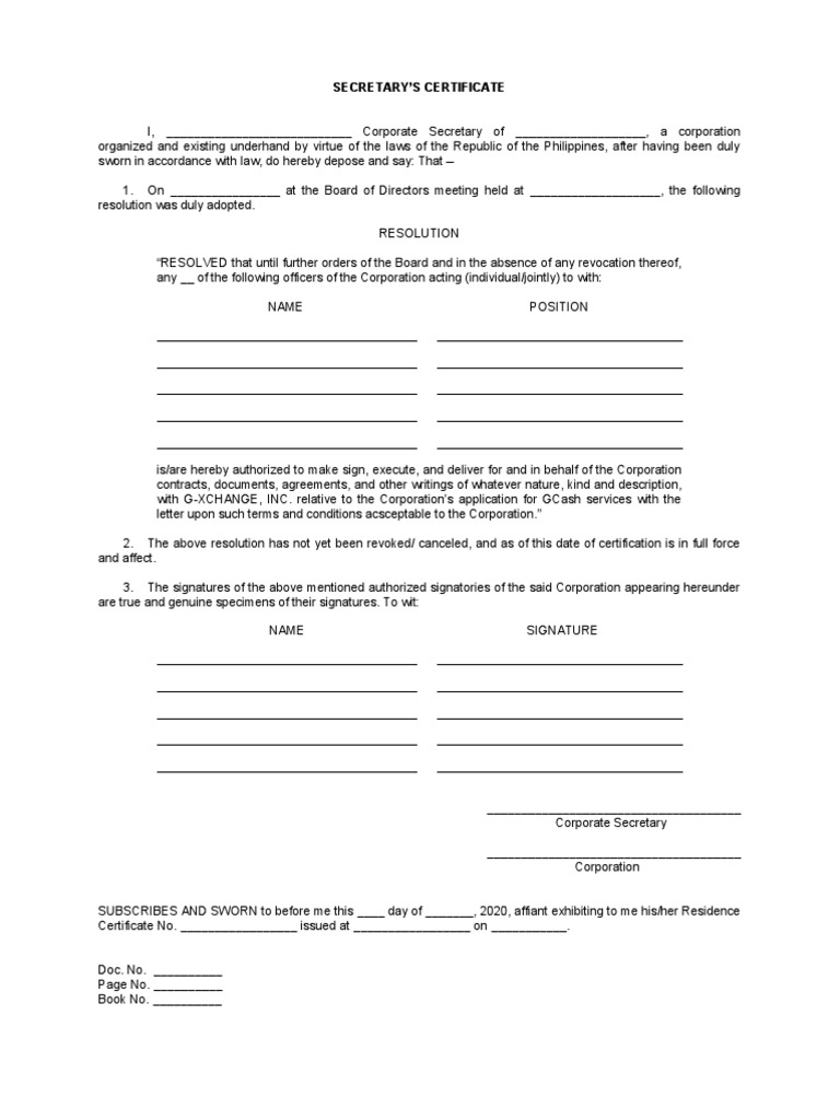 Sample Format Secretary's Certificate PDF