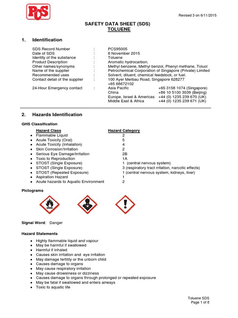Safety Data Sheet (SDS) Toluene 1. Identification GHS Classification