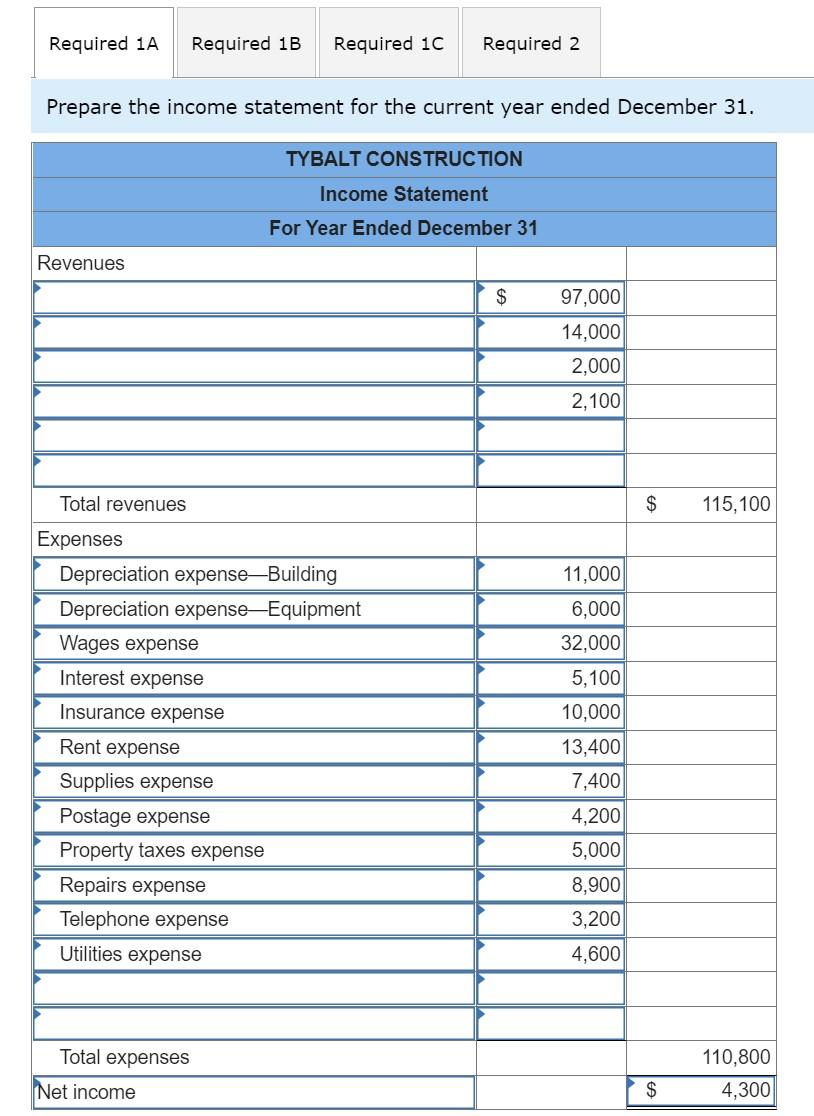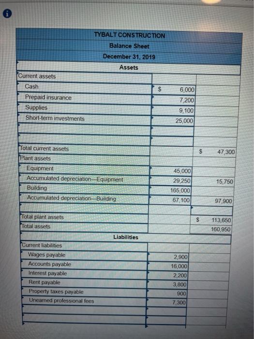 Tybalt Construction Balance Sheet - The adjusted trial balance for tybalt construction as of december 31, 2019, follows. Number account title debit credit;