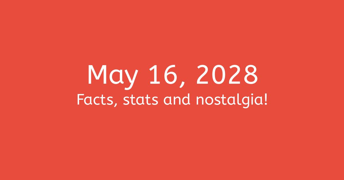 Your birthday is on may sixteenth, 2028. Web summary events birthdays deaths weddings 955 octavian, son of duke alberic ii of spoleto, elected pope john xii 1165. In the year of 2028, the 16th of may will be tuesday. Toggle navigation toggle search box calendar. Create a countdown for may 16, 2028 or share with.