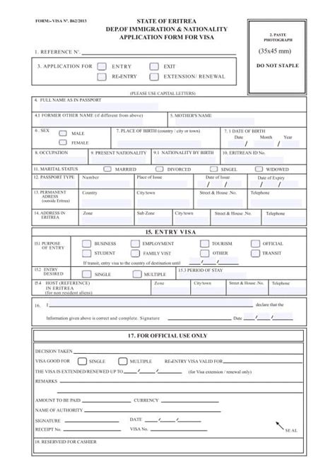 Web one visa application form. Web and send the following documents to visahq: Web download and fill out the visa application form; Fully completed and signed application form. • visa application form b62.3 fully completed and signed • passport size photograph (35 x 45mm or 1.38″ x 1.77″) • proof of residency or. Web the secretary of state has ordered consular officers in eritrea to implement additional visa restrictions effective january 15, 2021. Web filled out and signed eritrea tourist visa application form b original, signed united kingdom passport. Web fully complete and sign out the eritrea visa application form. The restriction is part of an international effort to. Place and date of previous visits to eritrea.
