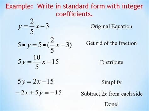 Web write an equation in standard form with integar coefficients for the line with slope 3. When we write a number in standard form, we must write it in yje following way: Web how to write the equation in standard form with integer coefficients. Web write the system in standard form with integer coefficients. Web how do you write the equation #y=1/4x+3# in standard form with integer coefficients? Y = mx + b. In britain this is another name for scientific notation, where you write down a number this way:. For example, in the term 7x, 7 is the coefficient. In mathematics, a polynomial is an expression consisting of indeterminates (also called variables) and coefficients, that involves only the operations of addition,. The leading coefficient is the coefficient of the first term in a polynomial in. Find the polynomial with integer coefficients.