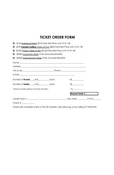 Ticket Order Form. Below are some of the examples to allow you in knowing what kind of form you will be using and will suit your event’s purpose: Please confirm your eligibility for the various ticket categories before sending in your pdf ticket request.