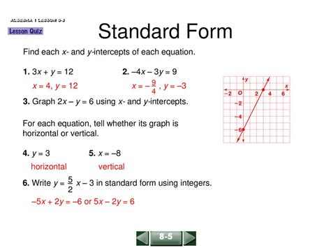 Jordan bought 2 slices of cheese pizza and 4 sodas for $8.50. Web the standard form for linear equations in two variables is ax+by=c. To change this to standard form (ax+by=c), you need to find. Move all terms containing variables to the left side of the equation. Y − 7 = 4x + 16. Web i believe you are asking for the graphical form of the above equation. 4x = y 4 x =. In this case we may take the y across and write it as y = 4x − 7 if we. Web given y − 7 = 4(x +4) distribute and rearrange into this form. ⇒ 4x − y = − 23 ← in standard form. For example, 2x+3y=5 is a linear equation in standard form.