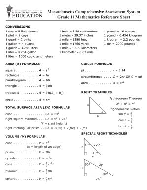 Web approved supplemental mathematics reference sheets. Web grade 7 mathematics reference sheet conversions 1 cup ˜ 8 fluid ounces1 inch ˜ 2.54 centimeters 1 pound ˜ 16 ounces 1 pint ˜ 2 cups 1 meter ˜ 39.37 inches 1 pound ˜ 0.454 kilogram 1 quart ˜ 2 pints 1 mile ˜. Web access cbt and pbt practice tests, as well as standard reference sheets for mathematics, and approved ela graphic organizers and reference sheets for students with disabilities. Mcas grade 10 mathematics reference sheet author: Web massachusetts comprehensive assessment system grade 10 mathematics reference sheet conversions cup = 8 fluid ounces pint = 2 cups quart = 2 pints gallon = 4 quarts gallon ≈ 3.785 liters liter ≈ 0.264 gallon. Web grade 10 mathematics reference sheet. Web approved supplemental mathematics reference sheets.