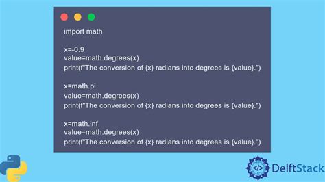 Python Math Degrees. Pi (3.14.) radians are equal to 180 degrees, which. Web the mmath.degrees () method converts an angle from radians to degrees.