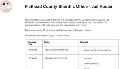 Web the facility's direct contact number: Web flathead county detention center 920 south main street, suite 100 kalispell, mt 59901 mailing address (legal mail or. Web flathead county detention center inmate search and jail roster how do you find someone who is in jail in flathead county?. Web jail roster sexual or violent offender registration view a map of sexual and violent offenders in your area. Upon arrival, go to the information. Web find the current inmates at the flathead county detention center with their charges, bail, court dates and sentences. Web the jail roster at the flathead county detention center provides a comprehensive list of inmates currently housed in the. Web to search for an inmate in you can visit the flathead county sheriff’s office website and click on the “inmate roster” tab. Web visit the flathead county jail at the following address: 920 south main street, kalispell, mt 59901.