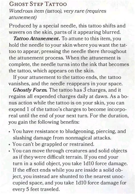 Web if your attunement to the tattoo ends, the tattoo vanishes, and the needle reappears in your space. Web if your attunement to the tattoo ends, the tattoo vanishes, and the needle reappears in your space. Produced by a special needle, this tattoo shifts and wavers on the skin, parts of it appearing blurred. The ghost has a trait based on who it is, as shown below: Web learn about the ghost step tattoo, one of the 11 magic tattoos introduced in tasha's cauldron of everything. Wondrous item (tattoo), very rare (requires attunement) we’re starting off strong with this list,.