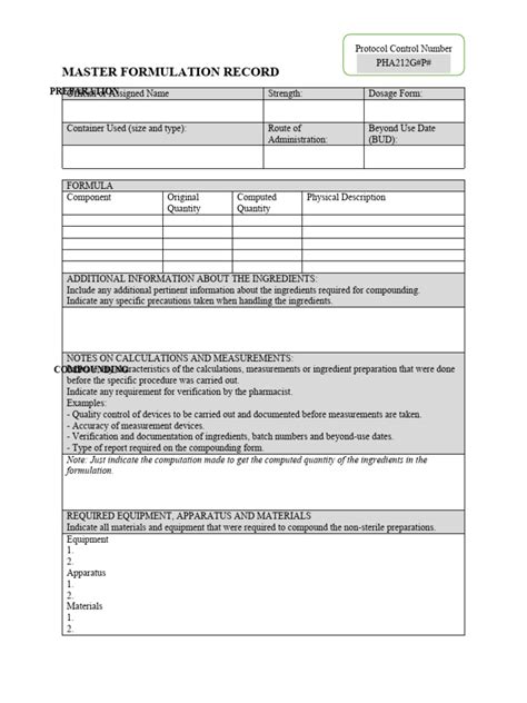 Web master formulation record page 1 of 2 december 7, 2020 template template master formulation record. Web template 1 template for developing a procedure. [generic name][brand name] [strength as metric. Web name of preparation (name, strength, dosage form, route of administration) 1. Web a master formulation record should be created compounding—sterile preparations 〈797〉, pharmaceutical before compounding a preparation for the first time. Web master formulation records compounding record; Web master formulation record page 1 of 2 december 7, 2020 template template master formulation record. Must be kept (in hard copy or electronic format) and be readily available to compounding.