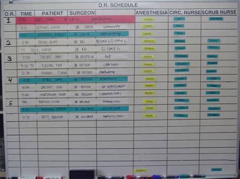 A schedule board for a surgical suite with five operating rooms; (left