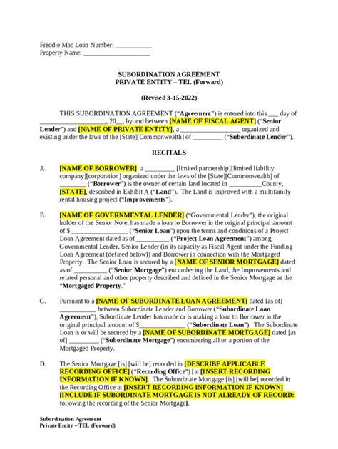 Web download this free subordination agreement template as a word document to create an outline of all the relevant clauses legally enforceable later Web a subordination agreement is a narrow form of intercreditor agreement that focuses on the priority of two or more creditors’ debts and claims concerning a. Web a subordination agreement is a legal document that establishes one debt as ranking behind another in priority for collecting repayment from a debtor. A subordination agreement is a legal instrument that lists loans or debts in the order of priority. Web download this free subordination agreement template as a word document to create an outline of all the relevant clauses legally enforceable later Web (3) that this agreement shall be the whole and only agreement between the parties hereto with regard to the subordination of the lien or charge of creditor's lien to the lien.