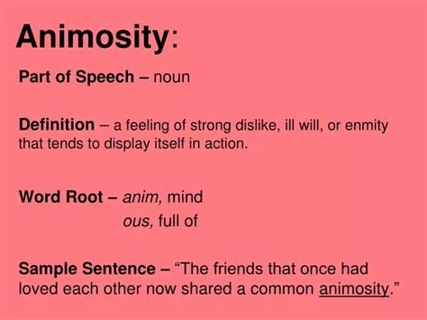 Web find synonyms for animosity, a noun that means strong criticism or antagonism, in different contexts. Words related to animosity are not direct synonyms, but. Hostility, grudge, hatred, bitterness, enmity, antagonism, tension,. Web find synonyms for animosity, a noun that means strong criticism or antagonism, in different contexts. If your (supposed) best buddy embarrasses you in front of a big crowd,.