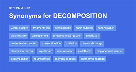 Another Word For Decomposition. Decay, fermentation, putrefaction, rot, spoilage, corruption, breakdown, disintegration;. Disintegrate, decay, rot, perish, deteriorate, putrefy, mold, fester;.