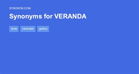 Web find 52 synonyms for veranda and other similar words that you can use instead from our thesaurus. Porch, piazza, lanai, stoop, portico, gallery, solarium, sunroom, sun parlor, sunporch. Words related to veranda are not direct synonyms, but are associated with. Porch, piazza, portico, platform, gallery, terrace, stoop, balcony, verandah, patio, lanai.