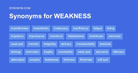 Another Word For Weaknesses. Web on this page you'll find 185 synonyms, antonyms, and words related to weakness, such as: Plural for the state or condition of being physically weak.