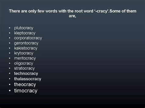 Cracy Root Word. For instance, the word plutocracy means government run by. A combining form occurring in loanwords from greek (aristocracy;