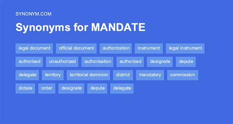 Synonyms for mandate (other words and phrases for mandate). An authoritative command especially : Accreditation, authorization, licence, license, commission, delegation, empowerment, promotion; On this page you'll find 30 synonyms, antonyms, and words related to mandates, such as: Authorization, command, decree, directive, injunction, and instruction. An authorization to act given to a. Web find 1,890 synonyms for mandate and other similar words that you can use instead based on 10 separate contexts from our thesaurus. A formal order from a superior court or official to an inferior one 2 : A document giving an official instruction or command. Instrument, legal document, legal instrument, official document.
