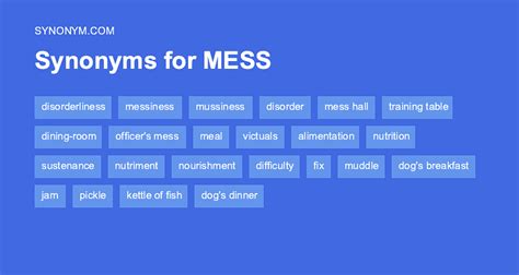 A dirty or unpleasant one. # disorder , muddle disarray n. Web synonyms for mess (with): Web synonyms of messy messy adjective definition of messy as in chaotic lacking in order, neatness, and often cleanliness having a messy room is virtually de rigueur for a college student synonyms & similar words relevance chaotic sloppy cluttered confused jumbled littered filthy messed dirty untidy shaggy stained tangled wrinkled muddled tumbled Havoc, hell, jumble, chaos, confusion, disarray, disorder, messiness; Play (with), toy (with), fool (with), tinker (with), tamper (with), fiddle (with), monkey (with), twiddle (with), manipulate, diddle (with) A dirty or unpleasant one. Need synonyms for a mess? 1 (noun) in the sense of untidiness. # confusion , muddle predicament n. Web find 6,208 synonyms for mess and other similar words that you can use instead based on 35 separate contexts from our thesaurus.