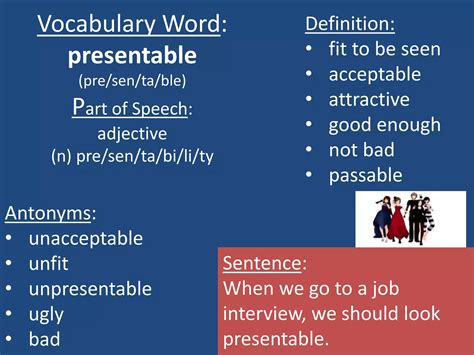 Web synonyms for presentable in free thesaurus. Web when someone is presentable, they're clean and tidy and generally pulled together. Web what is another word for more presentable? They're prepared for interacting with other people. 100+ synonyms & antonyms for presentable parts of speech synonyms similar meaning view all respectable decent passable satisfactory acceptable tolerable all right not bad fair neat tidy adequate fairly good personable suitable fit polite attractive good good enough decorous smartly dressed average proper tidily. Capable of being presented 2 : Tolerable, acceptable, attractive, becoming, decent, and fit. On this page you'll find 28 synonyms, antonyms, and words related to presentable, such as: When you first roll out of bed in the morning, you rarely feel very presentable. Web find 2,889 synonyms for presentable and other similar words that you can use instead based on 10 separate contexts from our thesaurus.