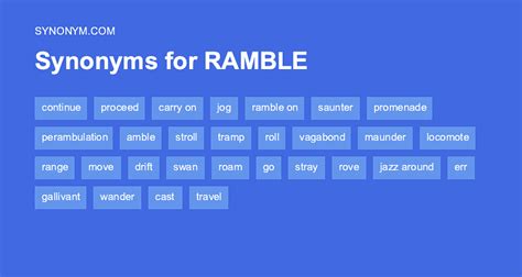 Move, travel, or proceed, also metaphorically. Web another word for ramble: Here's a list of similar words from our thesaurus that you can use instead. Origin uncertain synonym study for ramble 1. Noun [ c ] uk / ˈræm.b ə l / us / ˈræm.b ə l /. Roam, stroll, promenade, wander, meander, amble, perambulate, saunter, mosey, drift, stray, wander, meander, roam, range, rove, babble, chatter,. Solve your ramble crossword puzzle. Web synonyms & similar words. Excursions, travels, tours, jaunts, outings, walks, sallies, expeditions, spins, sorties In the countryside | collins english thesaurus (2)