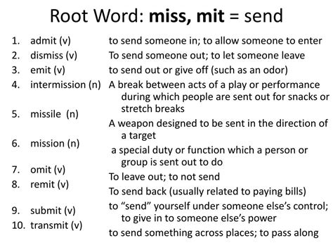 A list of 23 vocabulary words using the latin root miss, mitt: To send from one person or place to another. To carry or send away from a country; Web miss, mit root word practice match up by kellyha miss/mit word root maze chase by mstaffel mis/mit root practice maze chase by eelston mis/mit root word. Web the english root mit comes from a latin word that means ‘to send.’. To carry out of the. Web miss or mit means send. Terms in this set (11) admit to send someone in; Terms in this set (20) deport. A break between acts of play or performance during.