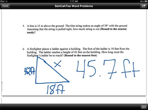 A) the base of the tree? Plus model problems explained step by step He spies a nut on the ground some distance away. A) 8 feet b) 23 feet c) 70 feet d) 25 feet ___ 2) a ladder leaning against a building makes an angle of 65d with the ground and reaches a After careful measurements, he determines the nut is 74º from the base of his tree. Web sohcahtoa word problems hw ___ 1) a wooden beam 24 feet long leans against a wall and makes an angle of 71d with the ground. Web free worksheet(pdf) and answer key on real world applications of sohchatoa. How far away is the nut from: There are basic solve for missing side questions, some harder ones, and then a word problem. Tan (θ) = of / apples