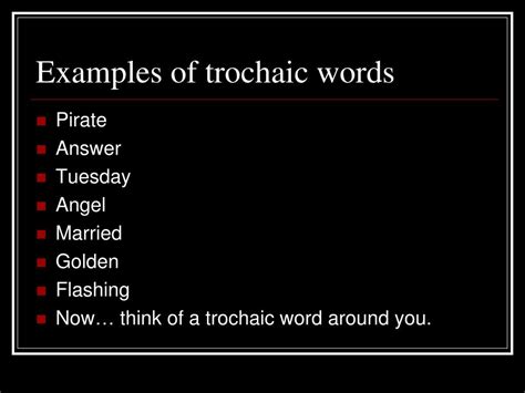 Web examples of trochaic words include “garden” and “highway.” william blake opens “the tyger” with a predominantly trochaic line: List of words ending with trochee: Words containing the letters t,r,o,c,h,e,e in any order we have listed all the words in the english dictionary that have the exact letters trochee in (in order),. A trochee, then, is a type of foot. Iamb, metrical foot, metre and foot. Trochees in poetry, a rhythmic unit of two syllables in which the first syllable is stressed is known as a trochee. List of words starting with trochee: See the full list of words here! Web all words containing trochee are listed here. Web all words containing trochees are listed here.