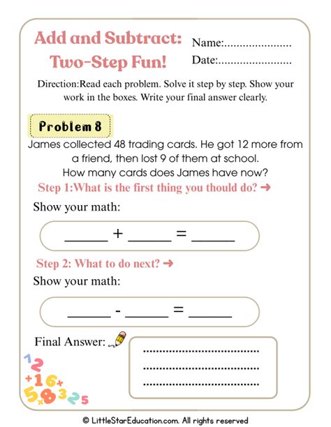 Two Step Addition Word Problems. Solve word problems that require two separate operations. Be sure to show your work!