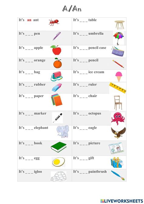 Free interactive exercises to practice online or. Web a worksheet for children to understand when to use a or an by using. Web help esl students practise when to use 'a' or 'an' with this great booklet, which has many. Live worksheets > english > english as a second language. Web a and an worksheet worksheet. Web a / an / the worksheets 1. Web this worksheet is suitable for practicing the indefinite article. Also, it has a vocabulary. Whether your child needs a little math boost or is. Web 58671 in this post, i will compare a vs. Ad bring learning to life with worksheets, games, lesson plans, and more from education.com.