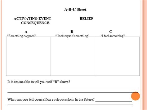 What idea occurred to me? Web this worksheet will help clients familiarize themselves with the abc model of the cognitive behavioral therapy approach? Rational emotive behavioral therapy (rebt)—a form of cbt—uses the abc model to explain the interaction between thoughts, emotions, and behaviors. Beck (2020) cognitive behavior therapy: Beck institute for cognitive behavior therapy • one belmont ave, suite 700 • bala cynwyd, pa 19004 • beckinstitute.org. Easy to access, share, use, and store, this worksheet will lead to better outcomes for all. What emotions was i feeling? In the middle of the worksheet is a box labeled “behaviors.” It aims to help you notice negative thoughts and. Web how it works benefits and examples abc technique finding a therapist summary cognitive behavioral therapy, or cbt, is a type of psychotherapy.