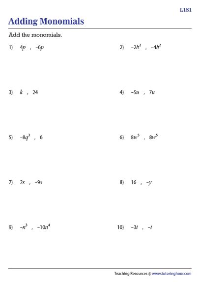 Web adding monomials worksheets math > algebra > polynomials > addition > monomials make great strides in practice with this set of meticulously designed adding monomials worksheets. Web math > algebra 2 > polynomial arithmetic > multiplying monomials by polynomials multiply monomials ccss.math: These monomials and polynomials worksheets are a good resource for students in the 5th grade, 6th grade, 7th grade, and 8th grade. Web our printable monomial addition worksheets, diligently prepared for high school students present an array of single and multivariate monomials for practice. The expressions contain a single variable. Web adding and subtracting monomials worksheets is a helpful resource for students trying to learn adding and subtracting monomials. Hsa.apr.a.1, hsa.apr.a google classroom multiply. Click here for a detailed description of all the monomials and polynomials worksheets. Adding and subtracting monomials is usually introduced in grade 4th and gradually advances to complex operations in higher grades. Three addend this set of printable worksheets requires high school students to perform polynomial addition with two or more variables coupled with three addends. Select the type of polynomials: