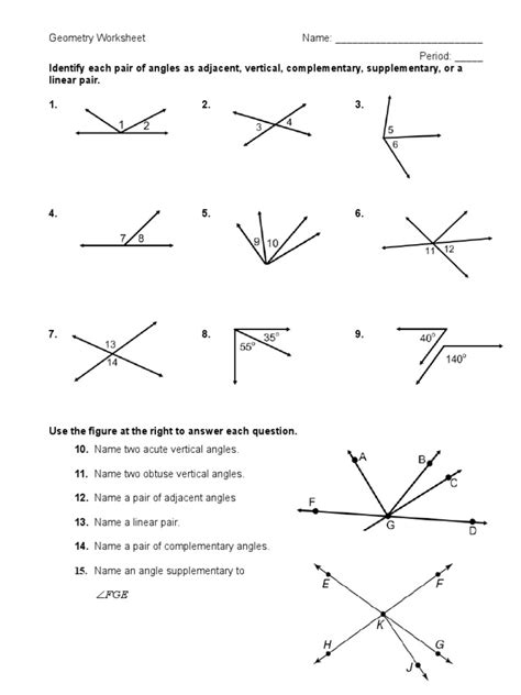 Web angle pair relationships date_____ period____ name the relationship: If ∠ 1=47°, then ∠ 2=43° 2. Answer key identifying pairs of angles 1) 2) 3) 4) 5) 6) 7) vertical adjacent and linear vertical adjacent adjacent and linear adjacent adjacent adjacent and linear 8) 5 6 a b y x g h 1 2 p q c d m n 1) a b linear pair 2) a b adjacent 3) a b adjacent 4) a b complementary 5) a b vertical 6) a b adjacent 7) a b linear pair 8) a b vertical find the measure of angle b. 9) b 50° 130° 10) 43° b 43° 11) 209° 96° b 55° 12. Web math 2 unit 1 worksheet 1 angle pairs relationship name: Web put your geometry skills to test with these worksheets where 6th grade students identify all the linear pairs by searching for sets of angles that are adjacent and supplementary in part a and find the linear pair of the specified angle in part b. Tap your grade 7, and grade 8 student’s potential in identifying the different pairs of angles such as complementary and supplementary angles, linear pair, vertical angles and much more with our engaging set of worksheets. Web printable worksheets @ www.mathworksheets4kids.com name : ∠ is supplementary to ________.