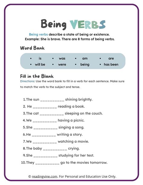 Web these worksheets practice the being verbs: Identify doing and being words verbs are doing or being words. In these grade 2 verbs worksheets, students have to identify verbs in sentences. Web these worksheets practice the being verbs: Some of the worksheets for this concept are conjugating verbs to be work, actionlinkinghelping verbs name date period rationale, name action verbs and verbs of being with pirates, helping verbs agreement work, name action verbs and verbs of being with pirates, helping verbs work, name. See preview for a better look at what's included! Exercises include identifying verbs, using verbs to complete sentences, linking verbs, conjugating verbs, verb tenses and irregular verbs. George washington carver and george washington. Writing verbs using verbs more verbs worksheets Web 101 printable pdf worksheets for the english grammar topic verb to be. Use our verbs worksheets to swing your reading, writing, and grammar instruction into action.