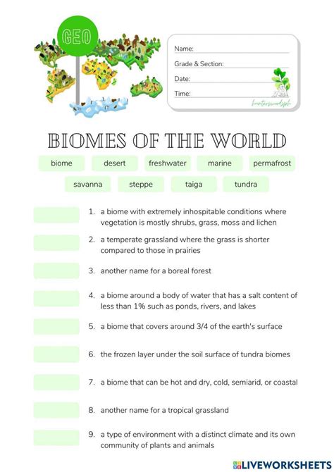 Aquatic • grassland • desert • tundra • forest • very little rain falls, so plants and animals here don't need much water biome with the. Worksheets are biomes work, biome chart work answers, biomes, biome work freshwater, biome organism matching game, te. Describe how the flow of energy derived from the. Web download a biomes worksheet with both pdf and digital options and answer key included. Web the graph plots the number of species and biomass at each of two locations , forest a with no invasive species , and forest b , with the invasive species. School success academy course title science none uploaded by. Web test your understanding of the five major biomes of earth and their features with this interactive quiz and worksheet. Web cycles of life and biomes. Web biomes of the world. You will be asked to list the biomes, understand how they are categorized. Aquatic • grassland • desert • tundra • forest • very little rain falls, so plants and animals here don't need much water biome with the.