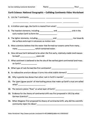 Web video instructions and help with filling out and completing colliding continents worksheet. One of the colliding continental plates will typically dive beneath the other. Nat geo colliding continents worksheet name _ hour _ dinah camps 3 earth science:. Web view nat geo colliding continents worksheet 2.docx from sci 2234 at troy university, troy. This is the name of the supercontinent that once joined today’s continents 350 million years ago? How did the alps and the himalayas form? Web browse colliding continents resources on teachers pay teachers, a marketplace trusted by millions of teachers for original educational resources. How many years ago did the supercontinent pangaea begin breaking up? Web get the national geographic colliding continents worksheet answer key you require. Name _ class _ colliding continents video worksheet video source Majority are found along the edges of some continents,.
