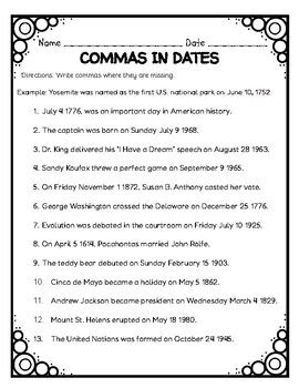Web advanced comma review worksheet perfect punctuation: 4.9 based on 46 votes. This assesses whether students know how to correctly use commas in a series, in dates, in addresses, and in the. Web browse comma in dates worksheet free resources on teachers pay teachers, a marketplace trusted by millions of teachers for original educational resources. Practice punctuating dates while learning about the most important days in. They help in separating the date, month, and year from each other. Take this short online quiz to find out how much you know about comma use when writing dates. Commas are always used in dates and addresses. Place a comma between the. First, it shows how to correctly use commas in addresses and dates,.
