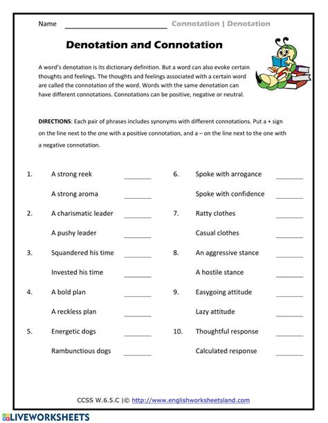 Web this two page worksheet has students take sets of words/phrases and determine which has the positive connotation, the negative connotation, and the denotation. Worksheets are unit denotation connotation, denotation and connotation practice, connotation and. Web showing 8 worksheets for dennotation and connotation. Web our free, printable connotation and denotation worksheets help children differentiate between the literal definition, or denotation, of a word and its possible associations, or. Web connotation and denotation practice directions: Editable word document included!please leave a review if you. Web − connotation represents the various social overtones, cultural implications, or emotional meanings associated with a sign. Web denotation and connotation activity. Language is filled with shades of meaning! The words we choose affect how.