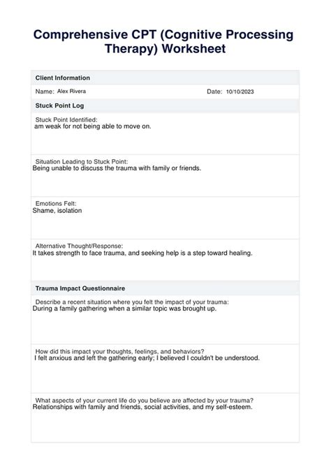 This means that it has been studied by researchers and found to be effective in treating ptsd. Underline the main term, then code accordingly 1. When using your own worksheets, please make sure to use a premade label (included in the clinician packet that should have been sent to) on. Web cognitive processing therapy (cpt) is one specific type of cognitive behavioral therapy. First, challenge stuck points directly using socratic dialogue and worksheets, but if a client is still stuck, examine the function of the stuck. Web cognitive processing therapy (cpt) for ptsd. What are the theories behind this worksheet? Web training components cognitive processing therapy. Web (cpt) has been organized to maximize the ease with which therapists prepare for and conduct cpt. Excision colon with anastomosis _____ 44140 2. By changing your thoughts, you can change how you feel.