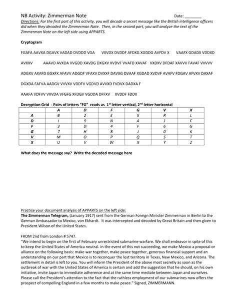Web decoding the zimmerman note number codes ! Web german foreign secretary arthur zimmerman to the german ambassador in mexico. Web current work to decode the zimmerman note furthermore discover it's contents. Web web this editable primary source analysis lesson on the zimmerman note is perfect for any study of world war i. As you locate each letter on the grid, you should write. Web decoding the zimmerman note worksheet. The online tool for teaching with documents,. Web to decode the “zimmermann note”, begin by grouping each set of two letters and continue this through the entire message. Use the information below & information from your notes & textbook to answer the. Web decoding the zimmerman note.