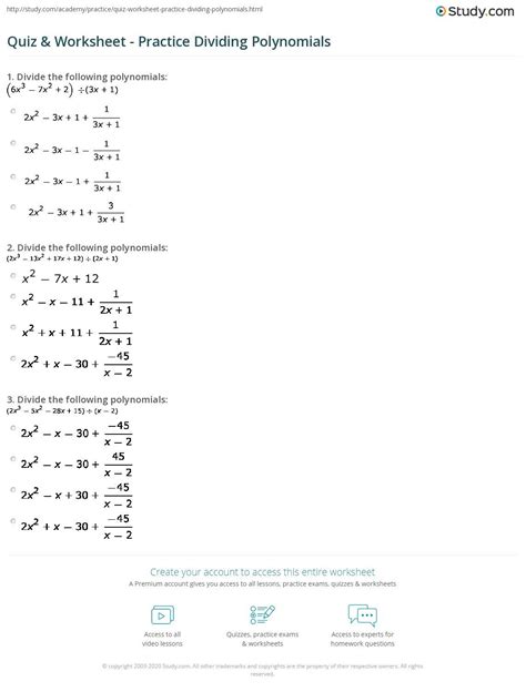 Web given a polynomial and a binomial, use long division to divide the polynomial by the binomial. After dividing each polynomial, students use a coloring key to color a. 03/18/2023 | next review date:. Web dividing polynomials worksheets for 6th grade and 7th grade. Web ( a a a ) (a ) (n n n ) (n ) divide using synthetic division. In the first part, there will be a discussion regarding the. Web instructions on how to use the “dividing a polynomial by a monomial worksheet (with answer key)”. 5) x x x x x x x x x no no x x x x x x x x x worksheet by kuta software llc Web free worksheet(pdf) and answer key on multiplying monomials. Web these worksheets focus on the topics typically covered in algebra i.
